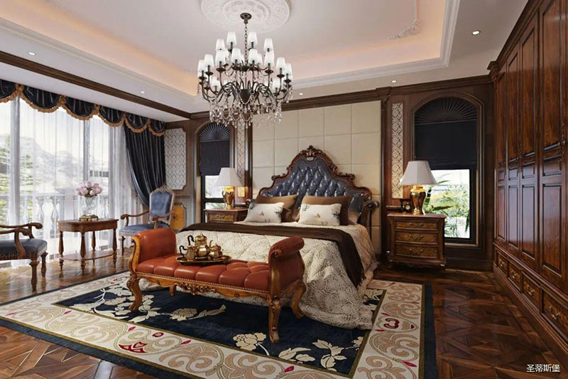次卧最为耀眼的就是爱情堡垒高屏床~外形拥有着美式堡垒的优雅大气,床屏犹如一座大山伫立在床头,寓意着“生活有靠山”。粗犷的线条轮廓与细腻的艳阳花拼接工艺,展现着生活中的浪漫与自由不羁。