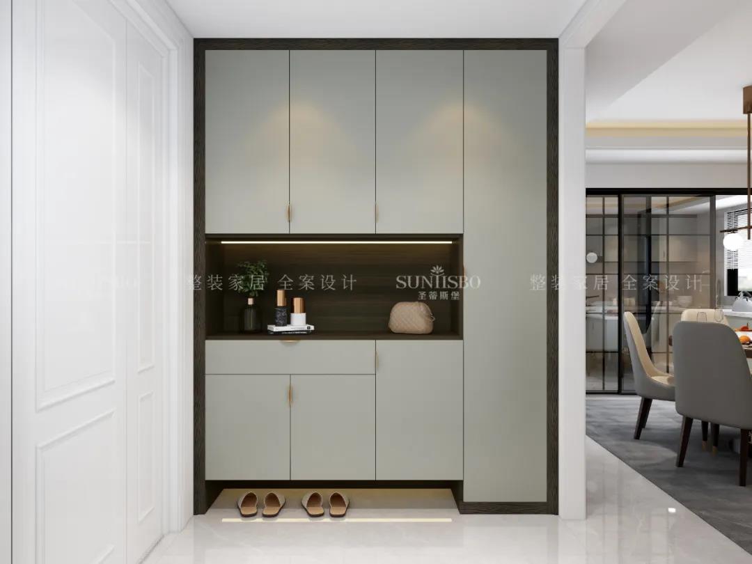 玄关吸纳了极简精华,采用极简线条将入户玄关模块化分割,完成了一场精简入户的仪式感。烟熏色与浅灰色彩有序排列出一个个性的极简入户空间。