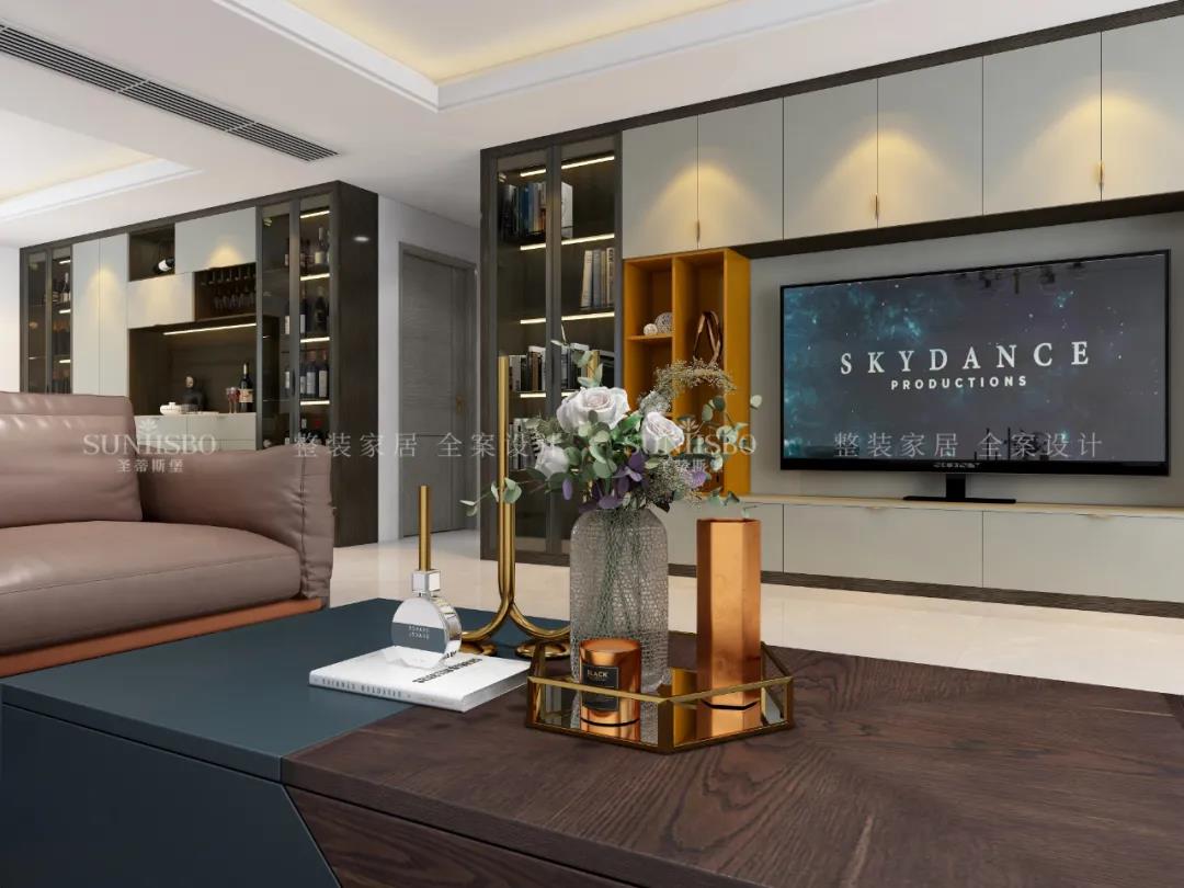 客厅一面置顶的定制柜,大大增加了空间收纳,也将电视背景墙的观赏性发挥到极致。浅灰与明亮橙的“动静”属性, 与沙发上的爱 马仕橙相呼应,从空间中漫溢出欢乐和跳动的乐章,回响生活中那一抹绚丽和精致,同时也拥有着对立且和谐的高级范儿。