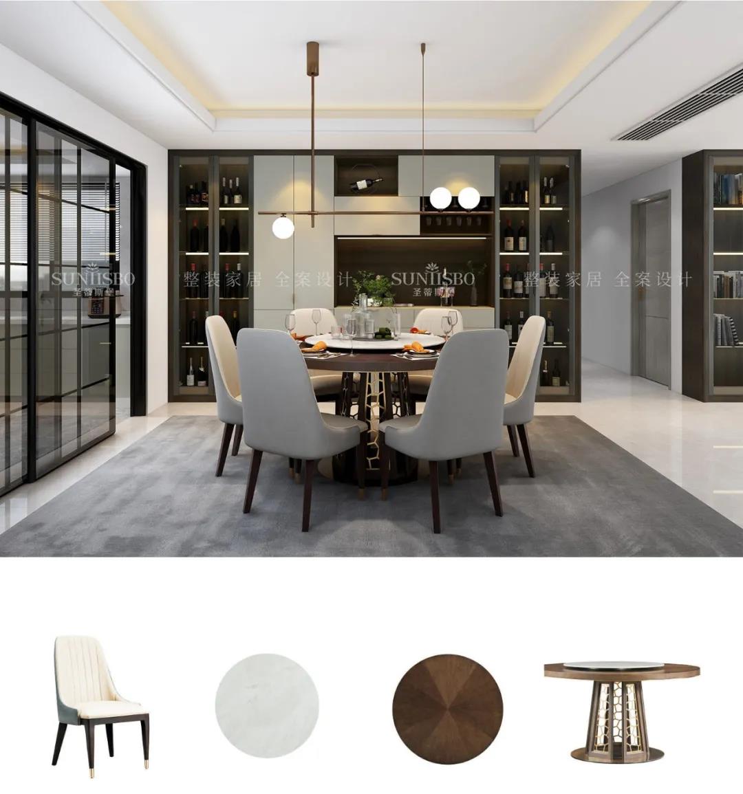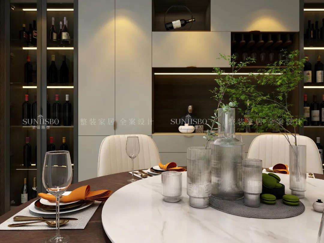 移步到餐厅空间,餐边柜立面简致,纹理细腻,展示区合理分配,增强了空间层次感,彰显出饱满的意式美感。实木柜面加以金属拉手的装饰,将极简现代与高端质感融合,以简约的形式表达出“简而不失其华”的感染力。