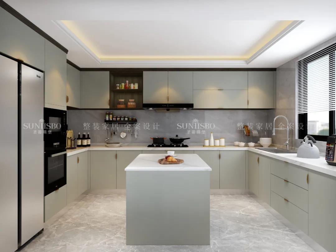 厨房的浅灰色调与明媚的自然光线重合,由空到满,完成了一场空间与质感的展示。案台上摆放的居家生活用品,充斥着温馨的生活气息。质感橱柜线条秩序排列出厨房空间的简约主题感。日光穿过百叶窗,将生活空间梳理的温柔且惬意!