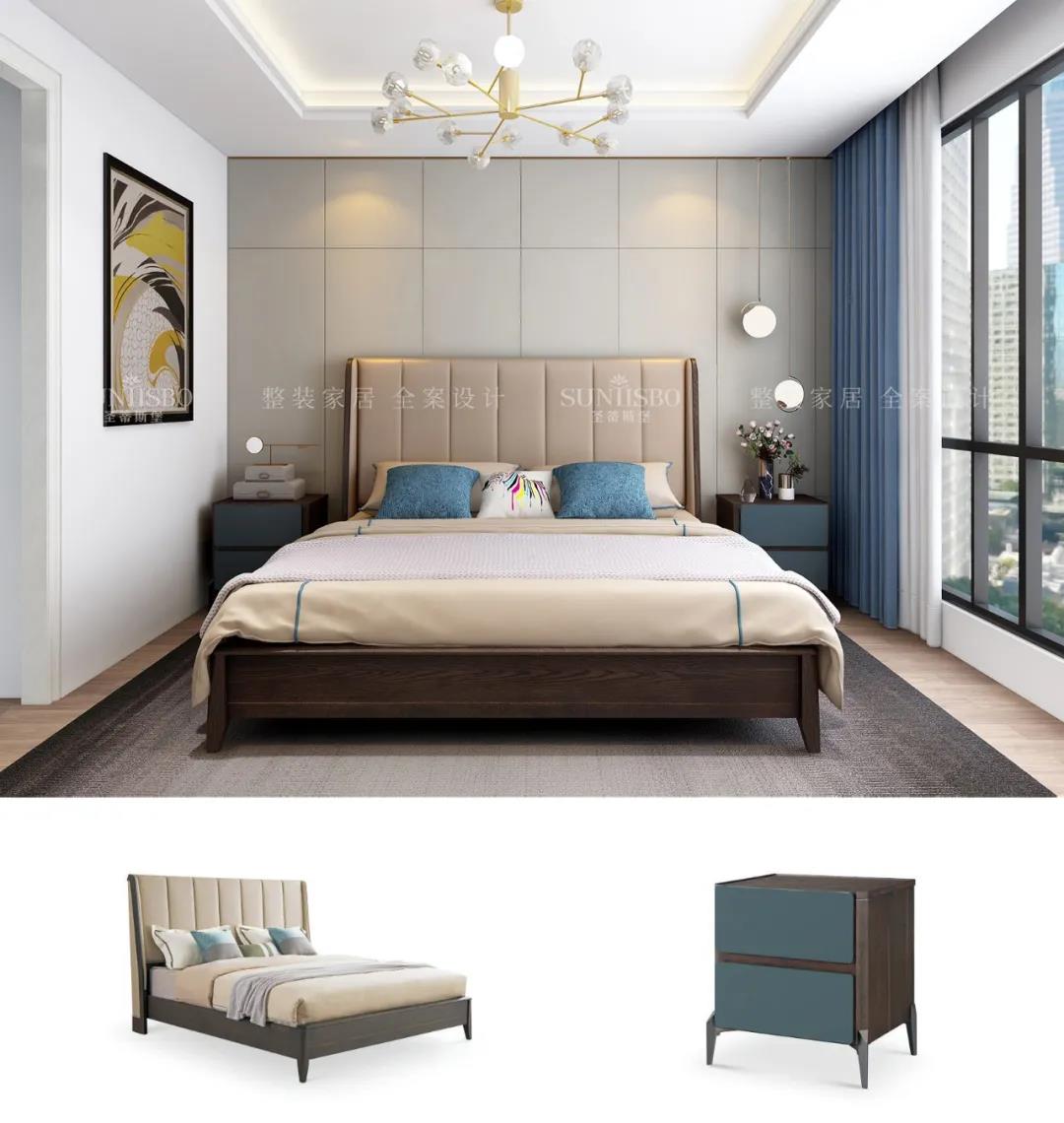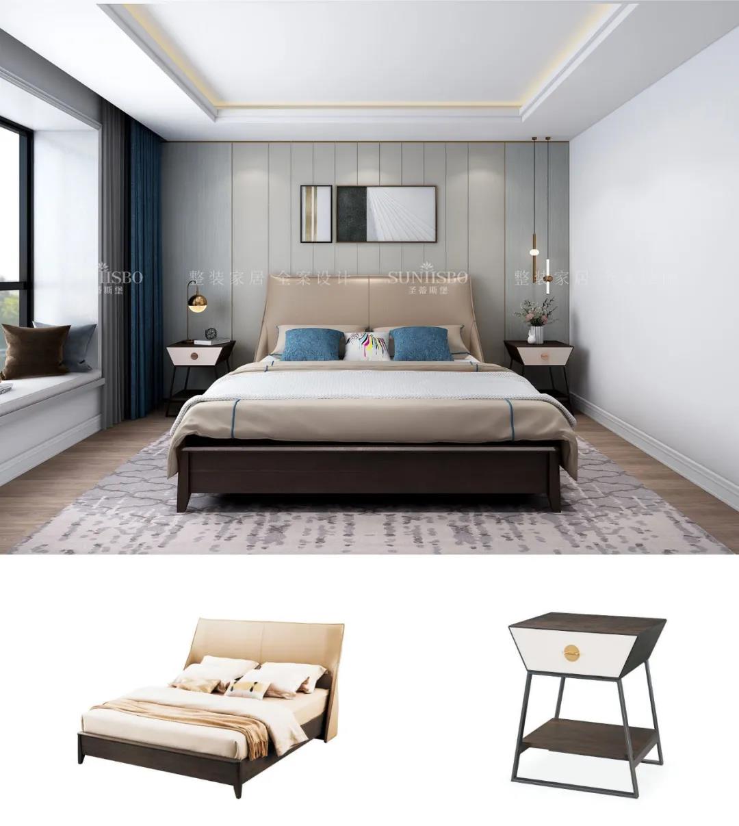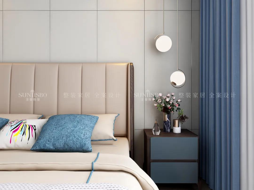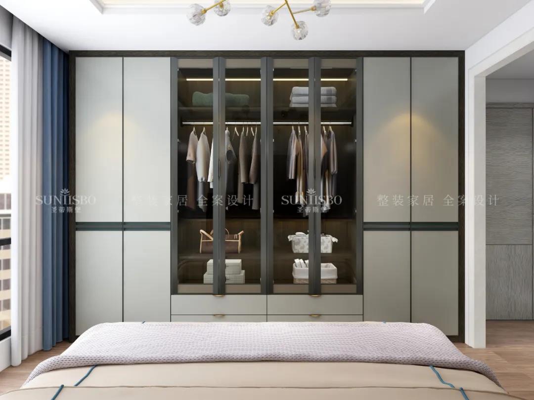 设计师运用最为百搭浅灰实木护墙板打造主卧空间,简约的线条纵横交错,带来了干净、清爽、舒适的视觉效果。明暗分区的衣柜在灯光的渲染下,虚实光影变换其中,为每个角落氤氲出浪漫的气息。