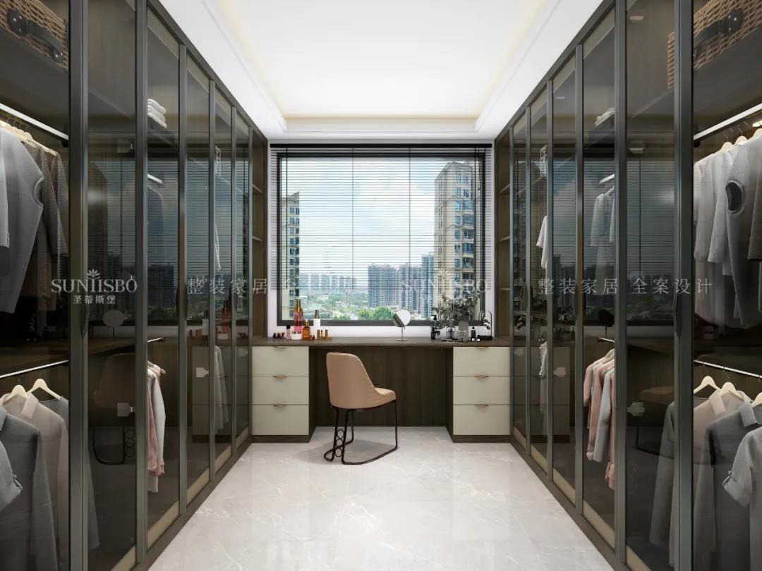 家的质感,并不是用琐碎的东西堆砌而成的,衣帽间是品质生活的一个重要的指标。这套衣帽间是以平行的格局设计成步入式空间,全开放式的呈现,金属与透明玻璃材质的糅合,衬托出柜体高级奢华的质感。