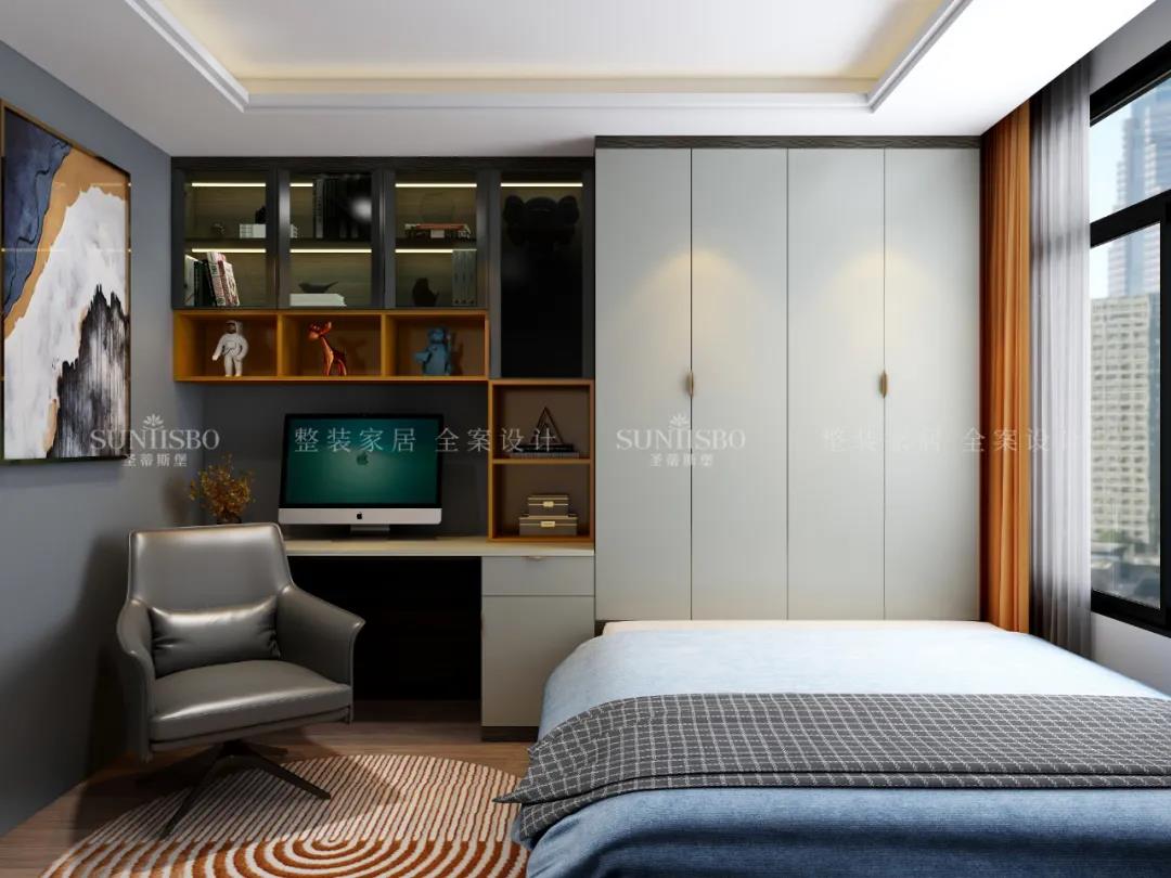 儿童房视觉上以简洁为主,书桌衣柜床一体式极简设计,让空间更轻便舒适。舒缓的色调与活跃的跳色合理搭配,营造出一个充满无限幻想的童话王国。