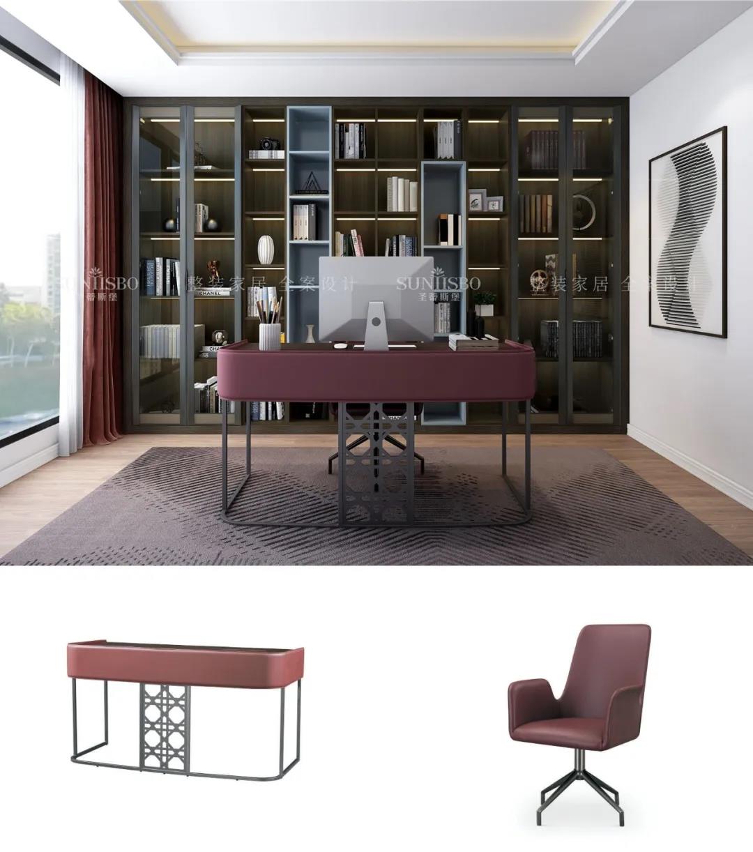 书房用定制柜解决了一面墙的设计,没有夸张的色彩装饰,简洁的柜体与墙面搭配起来显得十分精致整洁,透明的可视区域从视觉上扩大了空间感。闲暇时光,拾一本书,于书房,将生活与工作区分开来。