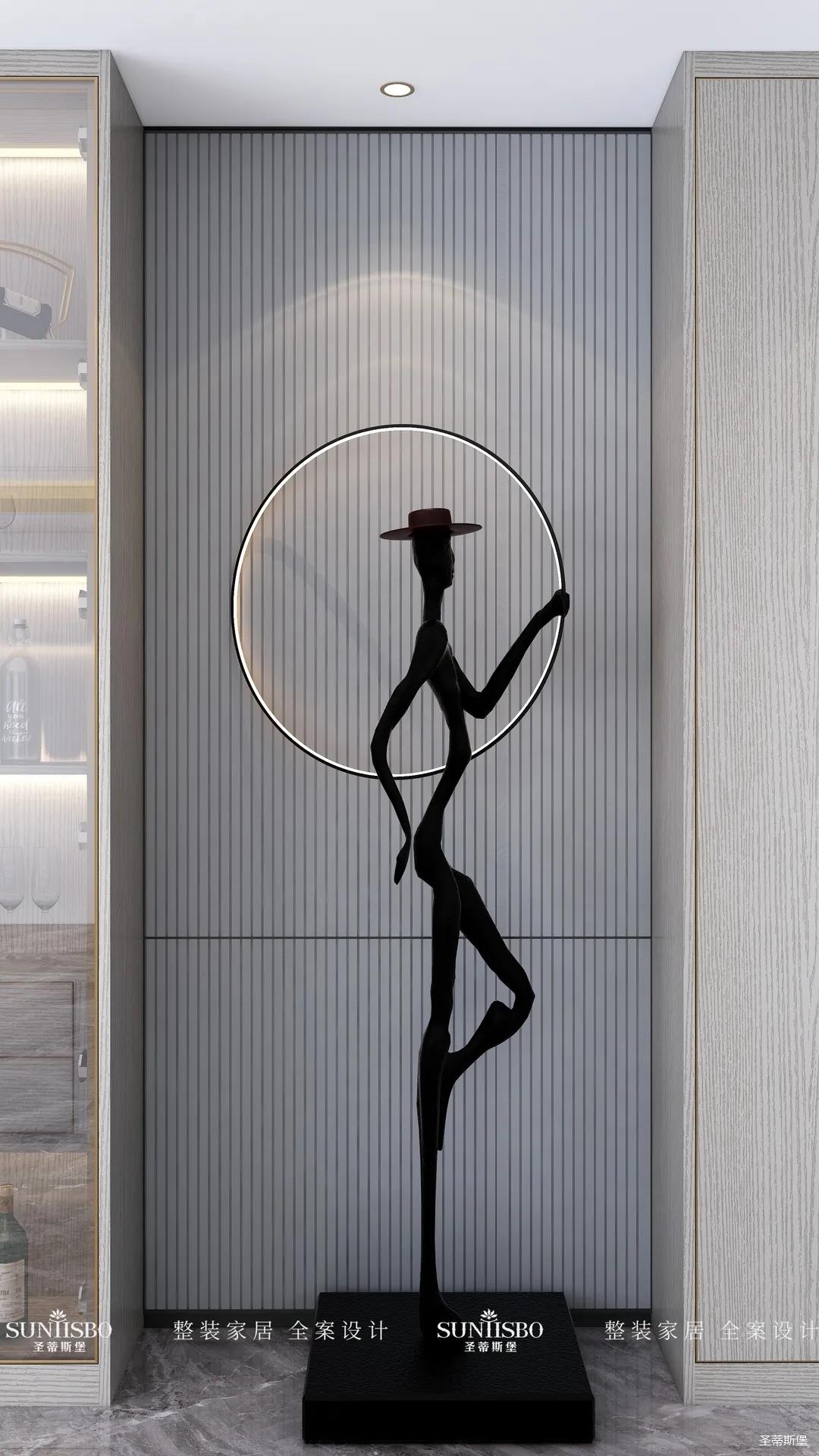造型独特的人形装饰伫立在过道与玄关之间,充满优雅气息。浅灰的线性纹理背景搭配黑色的造型,彰显着居者时尚的生活品位。