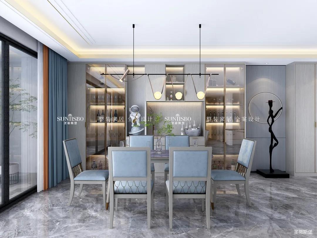 从优雅中款款而来,高级灰与雾霾蓝的冷静色调勾勒出一个高贵而又摩登的用餐空间。设计师从玄关直入打造一排定制柜体,包含了玄关和餐边柜,艺术灯形与时尚餐椅弧形相呼应,营造出温暖柔和的用餐环境。
