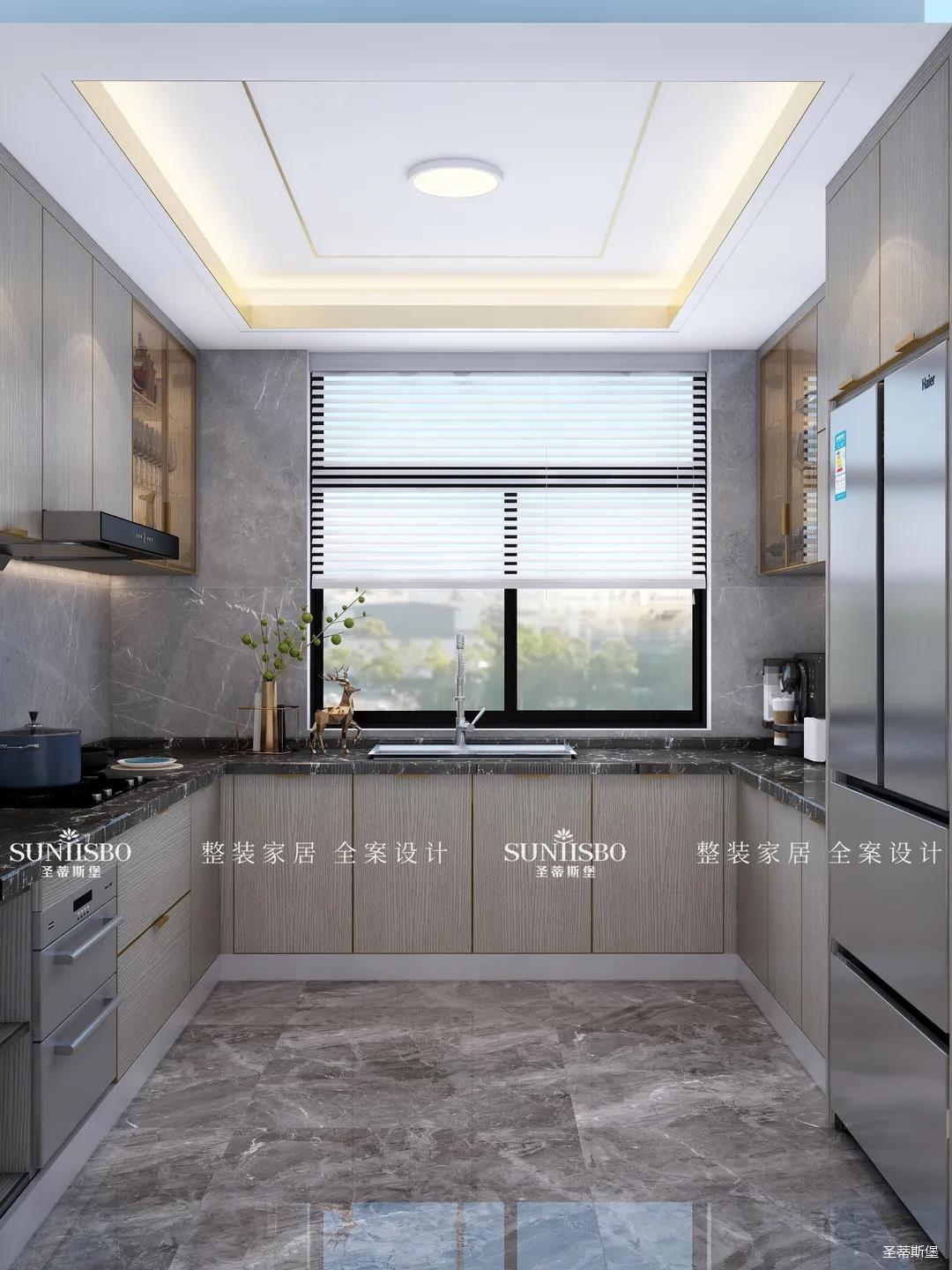 设计师以厨房&西厨区为布局的中轴,打开左右空间,延伸出厨房动线功能区,增加西厨区域,有效延伸空间。设计师打造了下午茶专属的中岛台,中岛台与客厅串连,方便屋主随时分享美食乐趣。