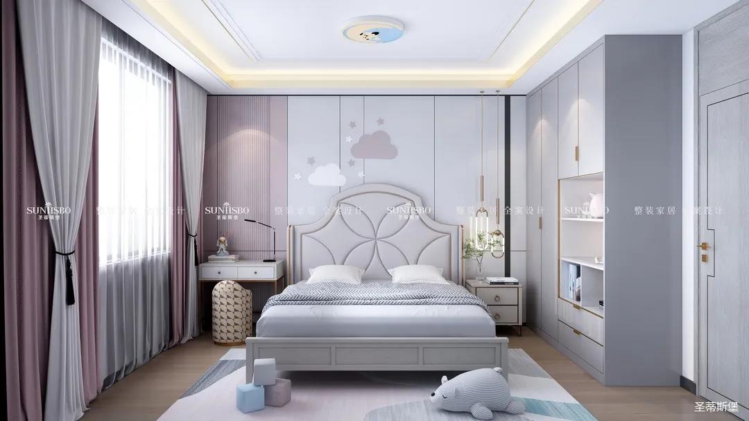 儿童房以粉白为基调,酝酿着世间充满童真和浪漫的语言。四照花型的床屏,让人联想到被粉色鲜花包围的公主王国。封闭式的收纳衣柜增加了开放式的儿童玩偶展示区,温馨又浪漫,让小孩在童话王国里长大。