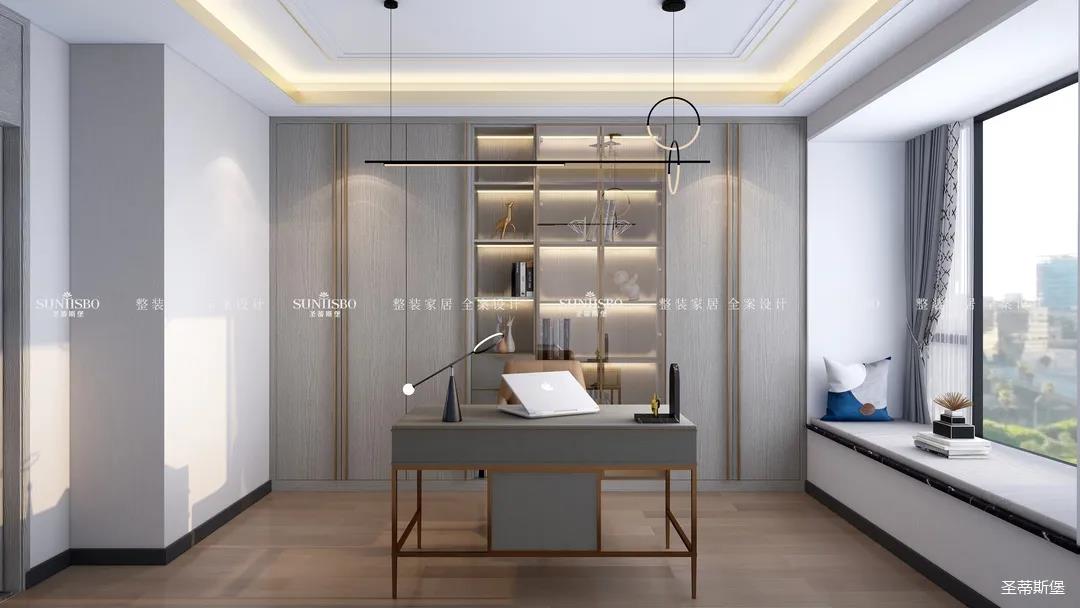 业主钟爱阅读,设计师将其中一间房打造为书房,设计的风格从布局到陈列,从色调到材质,都能给人一种优雅从容的感受。让业主在繁忙的生活中,有一处能够让人静心的空间品茶阅读。