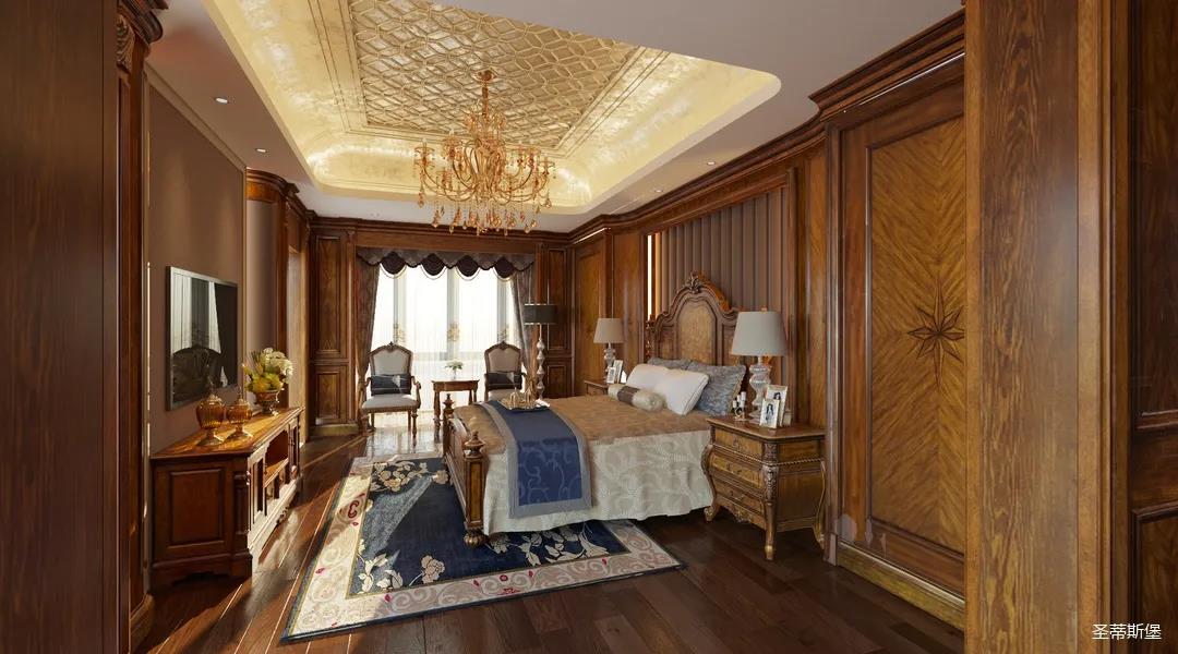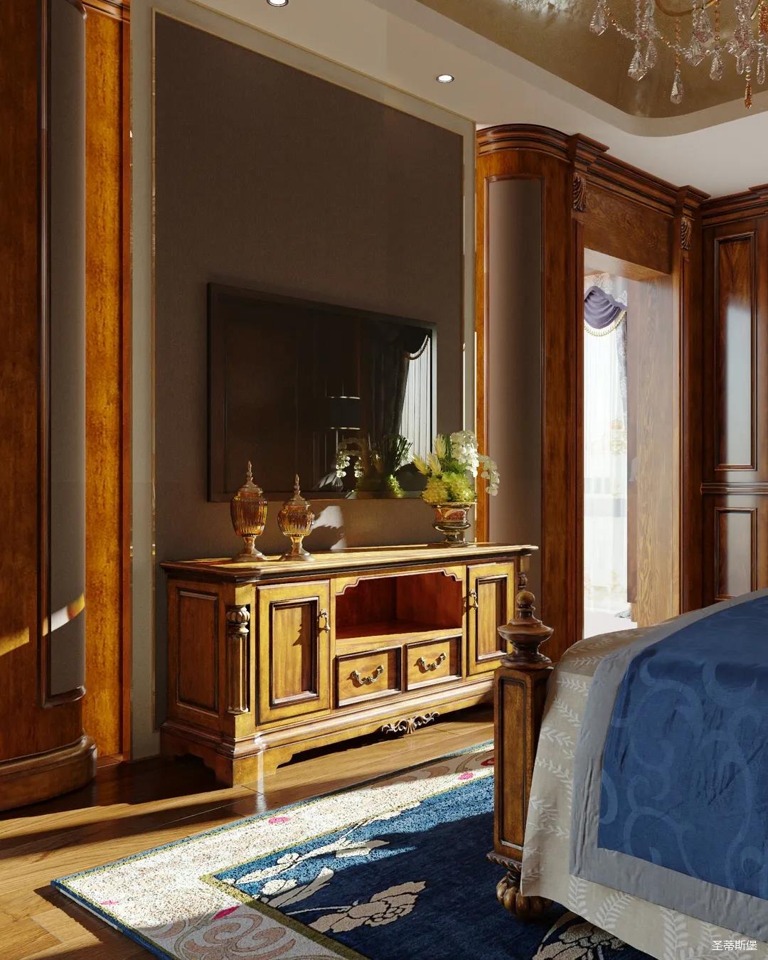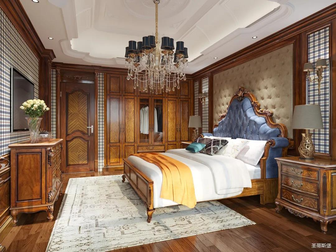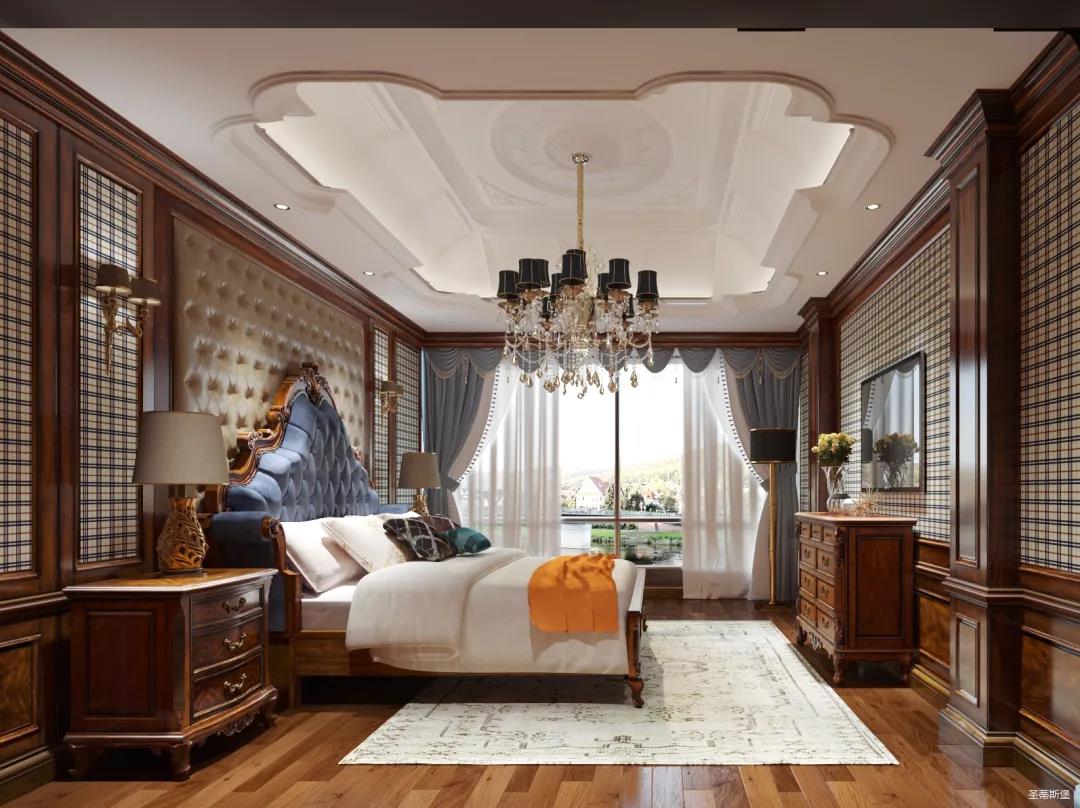 主卧整体设计是美式与现代的完美整合,既保留了纯正美式的形和实木雕刻艺术,又具有浓重的美式配色,浓浓的艺术气息不自觉在浪漫的美式空间流淌。流畅的弧线花饰以及丰富的木作线条别具匠心。大气稳重与舒适雅致并重,并借由开放的布局、灵活的动线,共同促成了整个空间极具复古浪漫的情调。